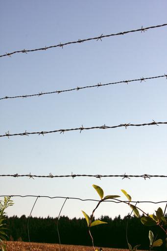 Keywords: barbed wire fence barbed wire metal fence iron risk caution wire pointed coupling sky pain grass flock sky blue lock blocking getting through defense