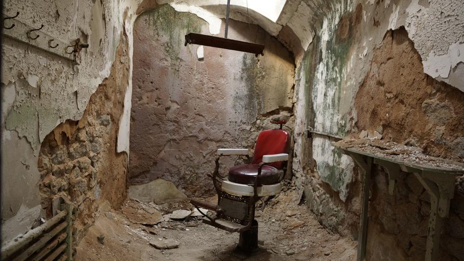 Keywords: barber shop chair barber salon male prison forgotten places ruin cell jail old penitentiary historic derelict history
