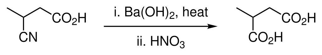 Keywords: Barium hydroxide-catalyzed methylsuccinic acid preparation.svg en Reaction scheme of barium hydroxide-catalyzed hydrolysis of a nitrile Own Calvero 2008-07-01 PD Image Methylsuccinic acid prepn png Nitrile hydrolysis