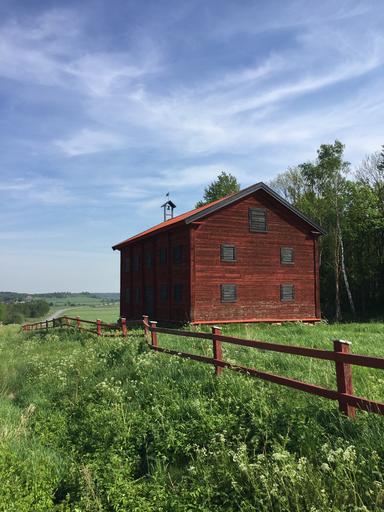 Keywords: barn blue sky greenery country red himmel go summer blue farmhouse cloud fence flowers tree