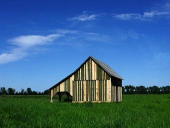 Keywords: barn old farm rural landscape blue sky green lawn grass plants trees horizon building roof structure farming storage house grains rustic agriculture