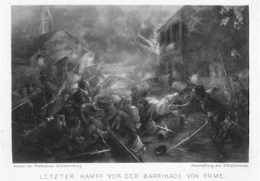 | Keywords: Barricade-beaune.jpg en End of French attack against the barricade Prussian closing the road Boiscommun / Orme on the evening of November 28 1870 fr Dernier assaut des Français contre la barricade Prussienne fermant la route de Boiscommun/Orme le soir du 28 Novembre 1870 Geschicht des Westphalish Infanterie-regiment Nr16 Mattschass 1900 PD-old Battles of the Franco-Prussian War French army 1870-1914 | ||||