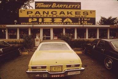 | Keywords: BartlettsPancakesWisconsin.jpg Tommy Bartlett's pancake and pizza restaurant Wisconsin 1973 Exterior view with signage promoting Pancakes Pizza Spaghetti Sandwiches Dinner Menu In front of the door a yellow w Oldsmobile with 1972 Iowa license plate 31 41377 is parked in the foreground This apparently was in Lake Dalton Wisconsin and later torn down and the site used for Tommy Bartlett's House of Tomorrow NEAR THE TOWN OF WISCONSIN DELLS THE WISCONSIN RIVER CHANNELS THROUGH DEEP SOFT SANDSTONE CLIFFS CUTTING THE ROCK INTO FANTASTIC SHAPES THESE NATURAL SPLENDORS HAVE GIVEN RISE TO A BOOMING TOURIST INDUSTRY PEOPLE COME IN DROVES OFTEN IN CAMPERS AND TRAILERS BOAT TRIPS SHOPS BARS AND DIVERSIONS OF EVERY KIND VIE FOR PATRONAGE IN AN AMUSEMENT COMPLEX EXTENDING 2 OR 3 MILES BEYOND THE TOWN 09/1973 Photograph by Jonas Dovydenas for Series DOCUMERICA The Environmental Protection Agency's Program to Photographically Document Subjects of Environmental Concern compiled 1972 - 1977 NARA-image 554188 Old version converted from gif to jpg and border cropped before upload New version lossless crop from File NEAR THE TOWN OF WISCONSIN DELLS THE WISCONSIN RIVER CHANNELS THROUGH DEEP SOFT SANDSTONE CLIFFS CUTTING THE ROCK - NARA - 554188 jpg 1973-09 Jonas Dovydenas No restrictions PD-USGov <gallery> File NEAR THE TOWN OF WISCONSIN DELLS THE WISCONSIN RIVER CHANNELS THROUGH DEEP SOFT SANDSTONE CLIFFS CUTTING THE ROCK - NARA - 554188 jpg uncropped JPEG from NARA File NEAR THE TOWN OF WISCONSIN DELLS THE WISCONSIN RIVER CHANNELS THROUGH DEEP SOFT SANDSTONE CLIFFS CUTTING THE ROCK - NARA - 554188 tif uncropped TIFF from NARA </gallery> location possible 1972 license plates September 1973 in the United States 1973 in Wisconsin Automobiles in Wisconsin Black on yellow license plates Color reversal Jonas Dovydenas Lake Delton Wisconsin License plates of Iowa Oldsmobile Omega X-body RWD Restaurant signs in the United States Pancakes of the United States Pizzerias in Wisconsin Tommy Bartlett Signs in Wisconsin U S Route 12 in Wisconsin Wisconsin Highway 23 Yellow automobiles |