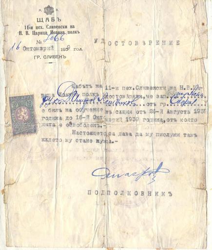 | Keywords: BASA-1868K-1-5-1-Asparuh Leshnikov.jpg Удостове ение от Щаба на 11 пехотен Сливенски полк за обучението на Аспа ух А и Лешников там Сливен 16 октомв и 1939 Asparuh Ari Leshnikov Ասպա ուխ Ա ի Լեշնիկով 16 10 1939 author ЦДА 1868K Аспа ух Лешников 1 5 1 credit line exhibition history BASA Спасими <span class signature-talk >talk</span> 2012-12-11 other versions Anonymous-EU Asparuh Leshnikov History of Sliven Documents in Bulgarian | ||||