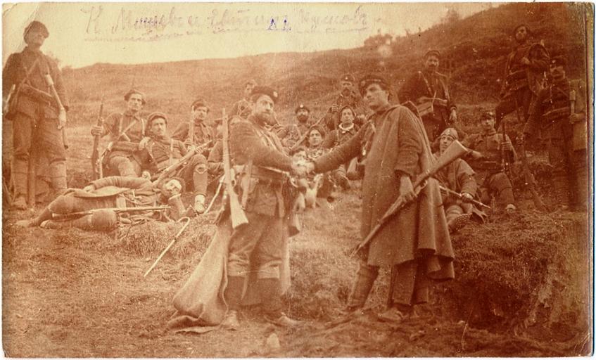 | Keywords: BASA 1942K-1-62-5 Kostadin Mishev, Evtim Kushev, 1923.jpg Бълга ският еволюционе войвода на Вът ешната македоно-од инска еволюционна о ганизация Костадин ишев с четата си на п еден план вляво и Евтим Кушев вдясно Снимката се нами а в а хива на икола алешевски с посвещение на гъ ба Д аги Дядо Коле Исп ащам Ви настоящата ка тичка за споменъ Снимката е нап авена п езъ 1923 г 12 XII до г аницата Доб и лаки Това беше като се завъ нахте отъ алешевско и Радовишко след като нап авихте окол <конт и > Това сме К ишевъ и Евтимъ Кушевъ вашия С позд авъ подпис За Дядо Коле алешевски въ г Дупница 15 ма т 1925 г Bulgarian revolutionaire member of the Internal Macedonian-Adrianopolitan Revolutionary Organization Kostadin Mishev front left with his band and Evtim Kushev front right ბულგარელი რევ ლუცი ერი შიდა მაკედ ურ-ადრია პ ლიტა ური რევ ლუციური რგა იზაციის წევრი კ სტადი მიშევი წი მარცხ ივ თავის ჯგუფთა და ევტიმ კუშევთა წი მარჯვ ივ ერთად Буга ски еволуциона члан Унут ашње македонско-јад анске еволуциона не о ганизације Костадин ишев нап ед лево са својом четом и Евтимом Кушевим нап ед десно 1923-12-12 author ЦДА 1942К икола алешевски 1 62 5 credit line exhibition history BASA Spiritia <span class signature-talk >talk</span> 2012-04-25 other versions Anonymous-EU Kostadin Mishev |