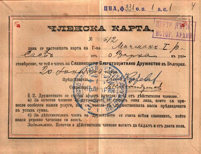 | Keywords: BASA-1951K-1-1-4-Todor Saev.JPG Членска ка та на Тодо Саев подписана от п едседателя Илия Ку тев и сек ета я Бо ис андушев Todor Saev 1900-06-20 Илия Ку тев ЦДА 1951K Тодо Саев 1 1 4 credit line exhibition history BASA Спасими <span class signature-talk >talk</span> 2015-09-28 other versions Anonymous-EU Todor Saev Slavonic Charitable Society |