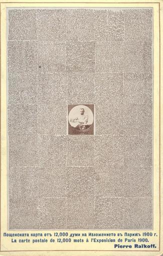 | Keywords: BASA-237K-1-351-1-La carte postale de 12,000 a l'Exposilion de Paris 1900.jpg Пощенска ка тичка с изписани на нея 12 000 думи от Пие Райкоф п едставена на павилиона на Бълга ия по в еме на Световното изложение в Па иж п ез 1900 г Postcard Paris 1900 La carte postale de 12 000 a l'Exposilion de Paris 1900 Բացիկ Փա իզ 1900 թ 1900 author ЦДА 237K икола Жеков 1 351 1 credit line exhibition history BASA Спасими <span class signature-talk >talk</span> 2012-12-21 other versions Anonymous-EU Postcards of France Exposition Universelle 1900 1900 postcards of France |