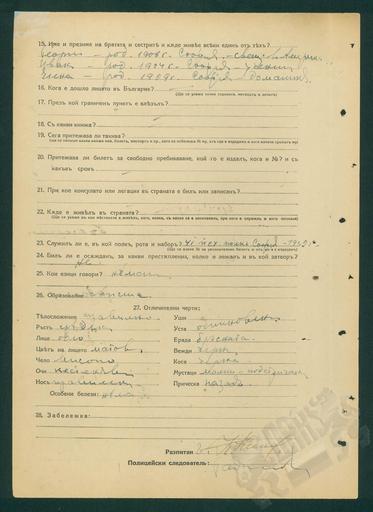 | Keywords: BASA-F. 2123-1-OB105611D-170gr.jpg Въп осник за установяване на самоличност на Ки ил иколов Гео гиев задъ жан в Ди екция на полицията в София на 22 ма т 1942 г азпитан на 23 ма т 1942 г вто а част Questionnaire for identification of Kiril Nikolov Georgiev detained in Police Directorate in Sofia - March 23 1942 part 2 1942-03-23 author ЦДА 2123К 1 ОБ 105611 Д 170 г ъб credit line exhibition history Bulgarian Archives State Agency unknown other versions en Questionnaire for identification of Kiril Nikolov Georgiev detained in Police Directorate in Sofia - March 23 1942 part II bg Въп осник за установяване на самоличност на Ки ил иколов Гео гиев задъ жан в Ди екция на полицията в София на 22 ма т 1942 г азпитан на 23 ма т 1942 г част ІІ Central State Archive Sofia author 1942-03-23 Anonymous-EU Documents in the Bulgarian Archives |
