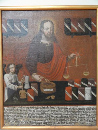 | Keywords: Basel 2012-10-06 Batch Part 4 (9).JPG Basel ” Pharmazie-Historisches Museum Christus als Apotheker Heiler und Tröster; Christus medicus mit helfendem Engel; unterer Teil mit deutscher Inschrift um 1705 oil on canvas own 2012-10-06 14 54 21 User Mattes 47 5583730556 7 58592472222 EXIF data with GPS coordinates and mag north GPS data may be inaccurate Commonist cc-by-2 0-de PD-Art reflection Collection of the Pharmazie-Historisches Museum Basel Balance scales in art 18th-century paintings of Jesus Christ Pharmacists in art 18th-century men looking at viewer in art 18th-century paintings of angels with humans Angels on the ground 1705 paintings 18th-century oil on canvas paintings in Switzerland Paintings in Basel Pfullendorf 18th-century unidentified painters Religious art in Switzerland Paintings with inscriptions 1700s paintings in Switzerland Template artwork possible Taken with Sony DSC-HX5VN Work by Mattes 2012 User Mattes/Contributions/Topics/Switzerland/Basel BS User Mattes/Contributions/Topics/Medicine User Mattes/Contributions/Topics/Arts Paintings with German inscriptions Christ as a pharmacist Old pharmaceutical containers |