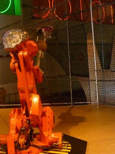 Keywords: Basketball Robot.JPG en Hoops a robotic basketball-shooting arm with 98 accuracy on display at the Roboworld in Carnegie Science Center Pittsburgh PA Before reprogramming it was an industrial robotic arm used for welding 2013-09-29 14 18 57 own Photojunkie Uploaded with UploadWizard Carnegie Science Center