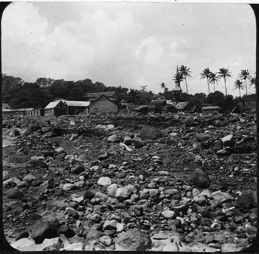 | Keywords: Basse Pointe YORYM-TA0306.jpg One slide and one negative The new delta at Basse Pointe - blocks transported by torrrential rain This delta was formed in a few hours as rains associated with the 1902 eruptions swept down large quantities of large debris Village in background - wooden houses some with thatched roofs and church with spire Palm trees depicted people depicted place Basse-Pointe Martinique 1907 Black and White glass Lantern slide Institution Yorkshire Museum Natural History object history exhibition history credit line Yorkshire Museum York Museums Trust accession number YORYM TA306 The Tempest Anderson Photographic Archive held at York Museums Trust <br> York Museums Trust image PD-old-100 PD-US Uploaded with UploadWizard Images from the Tempest Anderson Collection vulcanology 1902 eruption of Mount Pelée 1907 photographs Basse-Pointe |