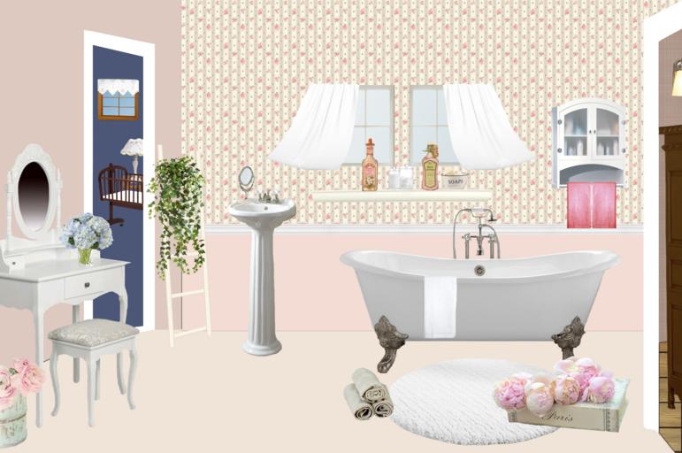 Keywords: bathroom bath antique rug vintage hairdresser mirror window drapes cabinet peonies ivy washbasin sink bottles personal care products