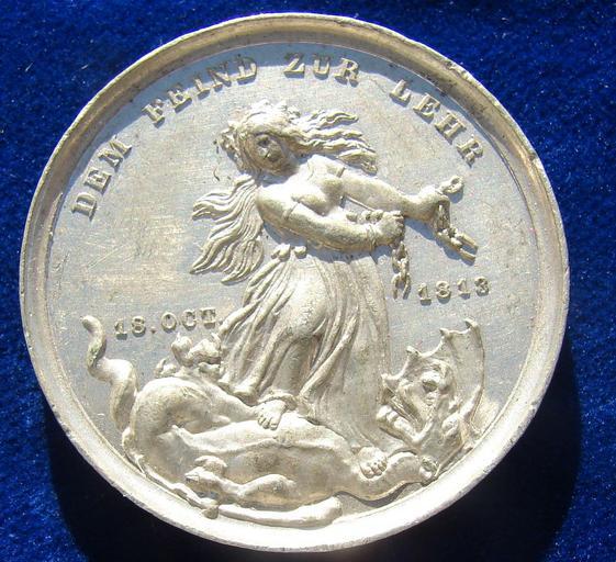 | Keywords: Battle of the Nations 1813 Pewter Medal 1863, reverse.jpg en 50th Anniversary Medallion d 40 mm The Battle of Leipzig or Battle of the Nations German Völkerschlacht French Bataille des Nations was fought 16 “19 October 1813 by the coalition armies of Russia Prussia Austria and Sweden led by the Russian Tsar Alexander I and prince Schwarzenberg against the French army of Napoleon I Napoleon's army also contained Polish and Italian troops as well as Germans from the Confederation of the Rhine The battle involved over 600 000 soldiers making it the largest battle in Europe prior to WWI Date 18 OCT 1863 divided by the Victory Angel around DEUTSCHLAND ZUR EHR ZUM 50TEN JAHRESTAGE DER SCHLACHT / Date 18 OCT 1813 divided by Germania standing on dragon and holding a broken chain in her hands Curved above DEM FEIND ZUR LEHR Medallists G Loos and Johann Karl Fischer 1802 Berlin - 1865 Berlin Condition Almost EXTREMELY FINE no hidden faults 2014-11-07 13 18 09 own Berlin-George other versions cc-by-sa-4 0 Uploaded with UploadWizard PD-old-100 Numismatics Commemorative medals Medals of Germany Battle of Leipzig 1813 Pewter medals |