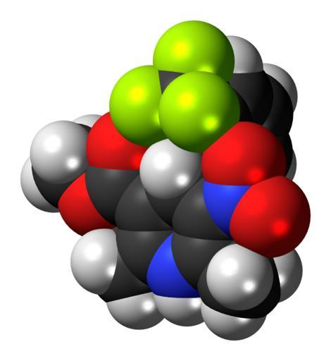 | Keywords: Bay-K8644-3D-spacefill.png Space-filling model of the Bay K8644 molecule a calcium channel agonist Colour code 505050 Carbon C black<br> F0F0F0 Hydrogen H white<br> F51E1E Oxygen O red<br> 3C50FA Nitrogen N blue<br> C8FA00 Yellow-green Fluorine F<br> 2011-06-13 own DS Visualizer Jynto talk Ball-and-stick version cc-zero Carboxylate esters Methyl esters Nitro compounds Trifluoromethylbenzenes Images by Jynto Space-filling models Dihydroazines | ||||