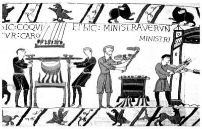 MAKE A MEME View Large Image Bayeux-feast02.jpg Cooking meat for a feast Detail from the Bayeux Tapestry Scanned from Maggie Black's Den medeltida kokboken Swedish translation of The Medieval Cookbook ISBN 91-7712-380-8 PD-old-100 Meals in art Food in art Bayeux ...