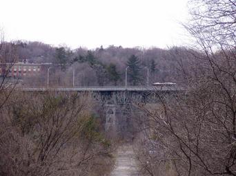 | Keywords: Bayview Bridge from Lawrence.jpg en A Toronto Transit Commission bus crosses over the Bayview Bridge built across the West Don River in Toronto Ontario Canada Photographed from Lawrence Avenue East in the Bridle Path Own GTD Aquitaine 2009-04-11 Road bridges in Toronto Don River Ontario |