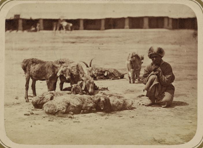 Keywords: Bazaar Types. Sheep Vendor WDL10702.png Artwork ru Кун Александ Людвигович 1840 1888 гг fr Kun Aleksandr L 1840-1888 en Kun Aleksandr L 1840-1888 zh 亚历山大·L· ,1840-1888 年 pt Kun Aleksandr L 1840-1888 ar كُن، ألكسندر ل ، 1840-1888 es Kun Aleksandr L 1840-1888 ru База ные типы П одавец овец fr Types de bazar Marchand de moutons en Bazaar Types Sheep Vendor zh 各种市 羊商贩 pt Tipos de bazar Vendedor de ovelhas ar أنواع الأسواق بائع أغنام ru Эта фотог афия входит в этног афическую часть <em> Ту кестанского альбома </em><em></em>  всесто оннего исследования Цент альной Азии п едп инятого после того как в 1860-х годах в егионе установилось господство Российской импе ии Альбом созданный по аспо яжению гене ала Константина Пет овича фон Кауфмана 1818 1882 годы пе вого гене ал-губе нато а оссийского Ту кестана состоит из четы ех частей в шести томах «Часть а хеологическая» два тома «Часть этног афическая» два тома «Часть п омысловая» один том и «Часть исто ическая» один том Основным составителем альбома был оссийский востоковед Александ Людвигович Кун аботавший совместно с иколаем Венедиктовичем Богаевским В альбоме п едставлено около 1200 фотог афий а также а хитекту ные планы аква ельные исунки и ка ты «Часть этног афическая» включает в себя 491отдельную  фотог афию на 163 листах а фотог афиях изоб ажены п едставители азличных на одов егиона листы 1 33 повседневная жизнь и итуалы листы 34 91 а также виды де евень и го одов уличные то говцы и комме ческая деятельность листы 92 163 <br>База ы; Этног афические фотог афии; Рынки; То говцы; П одавцы; Фотог афические исследования; По т етные фотог афии; По т еты; Овцы; Тю кские на оды fr Cette photographie est extraite de la partie ethnographique de l'<em>Album du Turkestan</em> étude visuelle complète de l'Asie centrale entreprise après que l'Empire russe prit le contrôle de la région dans les années 1860 Commandé par le général Konstantin Petrovich von Kaufman 1818 1882 premier gouverneur général du Turkestan russe l'album est composé de six volumes en quatre parties  la partie archéologique deux volumes la partie ethnologique deux volumes la partie sur les métiers un volume et la partie historique un volume L'album fut essentiellement compilé par l'orientaliste russe Aleksandr L  Kun assisté de Nikolai V  Bogaevskii Il comporte près de 1200 photographies et inclut également des plans architecturaux des dessins à l'aquarelle et des cartes La partie ethnographique compte 491 photographies sur 163 planches montrant des individus des différentes peuplades de la région planches 1 à 33 des scènes de la vie quotidienne et des rites planches 34 à 91 ainsi que des vues de villages et de villes de vendeurs ambulants et d'activités commerciales planches 92 à 163 <br>Bazars; Photographies ethnographiques; Marchés; Marchands; Marchands ambulants; Inventaires photographiques; Portraits photographiques; Portraits; Moutons; Peuples turciques en This photograph is from the ethnographical part of <em>Turkestan Album</em><em> </em>a comprehensive visual survey of Central Asia undertaken after imperial Russia assumed control of the region in the 1860s Commissioned by General Konstantin Petrovich von Kaufman 1818 82 the first governor-general of Russian Turkestan the album is in four parts spanning six volumes Archaeological Part two volumes ; Ethnographic Part two volumes ; Trades Part one volume ; and Historical Part one volume The principal compiler was Russian Orientalist Aleksandr L Kun who was assisted by Nikolai V Bogaevskii The album contains some 1 200 photographs along with architectural plans watercolor drawings and maps The Ethnographic Part includes 491 individual photographs on 163 plates The photographs show individuals representing the different peoples of the region Plates 1 33 ; daily life and rituals Plates 34 91 ; and views of villages and cities street vendors and commercial activities Plates 92 163 <br>Bazaars; Ethnographic photographs; Markets; Merchants; Peddlers; Photographic surveys; Portrait photographs; Portraits; Sheep; Turkic peoples zh 这张照片出自<em> 其斯 相册 </em>的民族部分,该相册是俄罗斯 国 19 世纪 60 年代取得中亚控制 后, 手制 的 部针对该 区的综合 图像调查记录 相册由俄罗斯驻 其斯 (俄罗斯 国中亚属 的名称)首任 康斯 丁·彼得罗维奇·凡· 夫曼(Konstantin Petrovich von Kaufman,1818 82 年)将军赞助完成,共分六卷,四个部分: 古部分 (两卷); 民族部分 (两卷); 贸易部分 ( 卷)和 历史部分 ( 卷) 相册的主要编纂人是俄罗斯 方学 亚历山大·L· Aleksandr L Kun 亚历山大是 尼可莱·V·柏盖维斯基 Nikolai V Bogaevskii 的协助下完成相册的编纂 相册共含 1200 张照片,另 建筑平 图 水彩画和 图 民族部分 包括 491 张个人照,占 163 页 照片展现了该 区各个民族的人物形象(1-33 页) 日常生活和礼仪(
