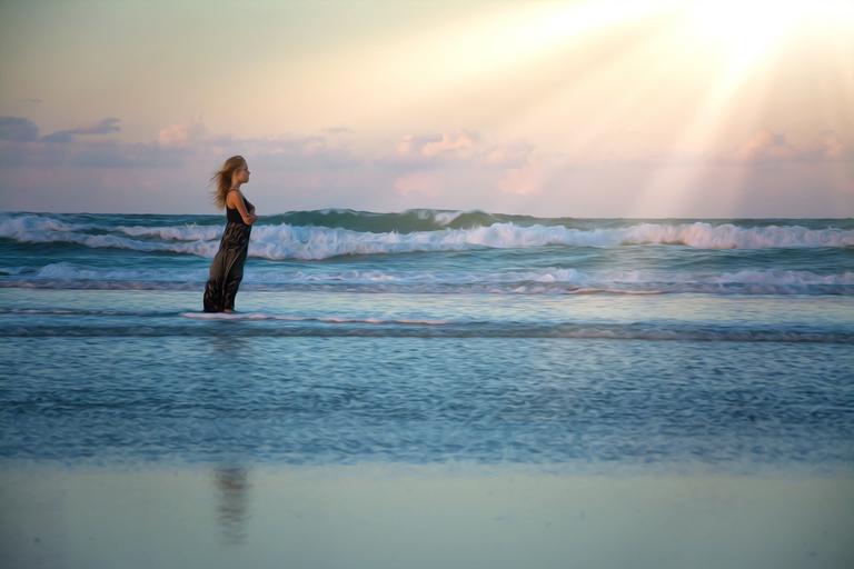 Keywords: beach girl ocean waves vacation sun sunrise travel oil painting