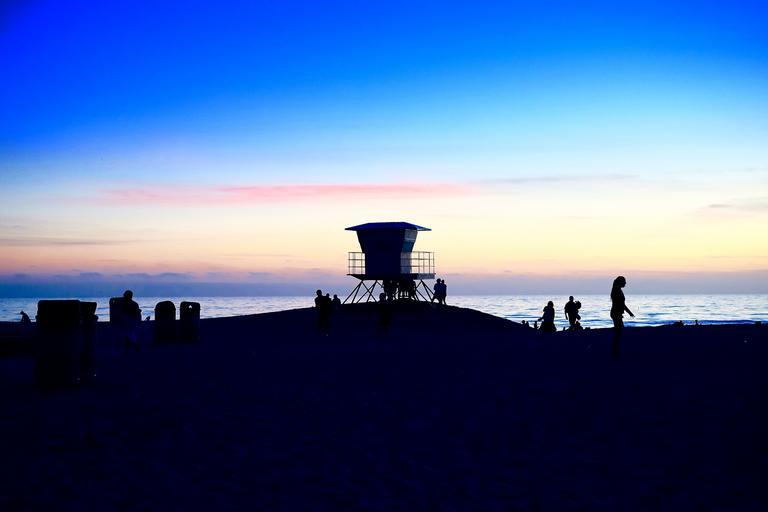 Keywords: beach lifeguard tower m lookout evening ocean sea safety summer sand people persons vacation swimming rescue silhouette