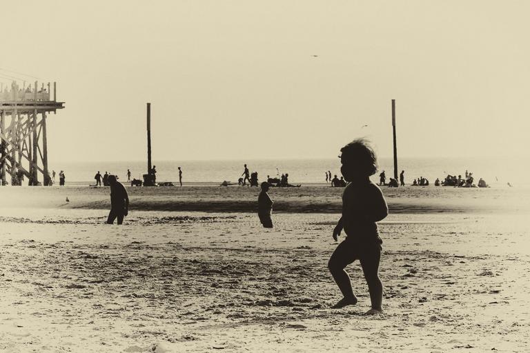Keywords: beach sand beach small child north sea sea holiday sepia