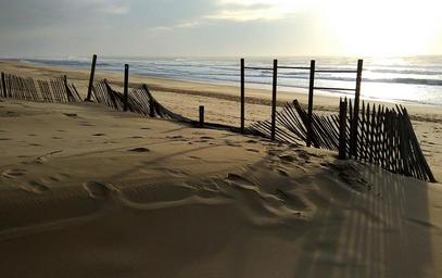 Keywords: beach sunset evening barrier stakes twilight
