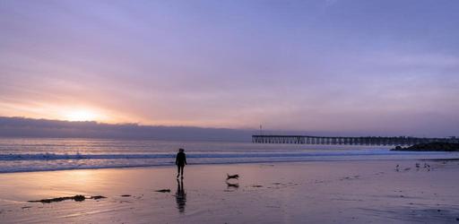 Keywords: beach sunset woman dog waves shore coast ocean twilight dusk landscape scenic seascape evening sea sand silhouettes