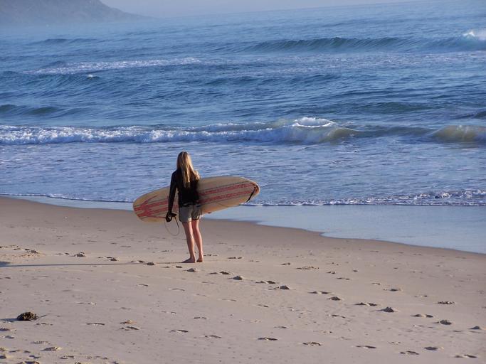 Keywords: beach surfer sea ocean wate blue sandy shore girl female surfboard surf sporty recreation lifestyle