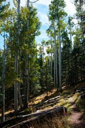 | Keywords: abineau-bear jaw loop abineaubearjawloop arizona bear jaw trail bearjawtrail bear jaw trail #26 bearjawtrail26 bear jaw trail no. 26 bearjawtrailno26 coconino national forest coconinonationalforest flagstaff ranger district flagstaffrangerdistrict forest service forestservice kachina peaks wilderness kachinapeakswilderness san francisco mountain sanfranciscomountain san francisco peaks sanfranciscopeaks usfs flagstaff forest hiking mountain outdoors peaks trail wilderness outdoor landscape Abineau Trail is a steep 1,800 foot climb over two miles up the slopes of the San Francisco Peaks through Abineau Canyon. The trail meets the Waterline Trail at the top, which can be followed down to Bear Jaw Trail to return to the trailhead. Each leg of the loop is around two miles long, plus a 0.4 mile connector trail from the trailhead to the loop, making a total loop hike of seven miles. The loop is one of the quintessential autumn hikes in the San Francisco Peaks. Aspens along all three legs of the loop turn gold, and falling leaves carpet the forest floor and decorate the conifers. A storm system passed through the area October 4-7, 2015, raining at lower elevations and snowing on the upper reaches of the San Francisco Peaks. The snow-capped Peaks were a wonderful treat after the few days grey, cloudy, wet weather that had put a damper on outdoor activity. Photo by Deborah Lee Soltesz, October 8, 2015. Credit: U.S. Forest Service, Coconino National Forest. For more information about this trail, see the Abineau-Bear Jaw Loop trail description on the Coconino National Forest website. Abineau Trail is a steep 1,800 foot climb over two miles up the slopes of the San Francisco Peaks through Abineau Canyon. The trail meets the Waterline Trail at the top, which can be followed down to Bear Jaw Trail to return to the trailhead. Each leg of the loop is around two miles long, plus a 0.4 mile connector trail from the trailhead to the loop, making a total loop hike of seven miles. The loop is one of the quintessential autumn hikes in the San Francisco Peaks. Aspens along all three legs of the loop turn gold, and falling leaves carpet the forest floor and decorate the conifers. A storm system passed through the area October 4-7, 2015, raining at lower elevations and snowing on the upper reaches of the San Francisco Peaks. The snow-capped Peaks were a wonderful treat after the few days grey, cloudy, wet weather that had put a damper on outdoor activity. Photo by Deborah Lee Soltesz, October 8, 2015. Credit: U.S. Forest Service, Coconino National Forest. For more information about this trail, see the Abineau-Bear Jaw Loop trail description on the Coconino National Forest website. |