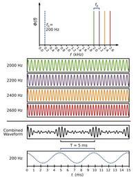 | Keywords: Beat frequency (2000, 2200, 2400, 2600).svg en A diagram showing four sinusoids of frequencies 2000 2200 2400 and 2600 hertz green purple orange and red Also shown is the summed signal black and the sinusoid with the same period as the beat frequency f<sub>0</sub> 200 Hz Above is the spectrum of the signals own Inductiveload 2009-02-15 Beat frequencies Audiology Sensory Neuroscience Hearing and speech | ||||