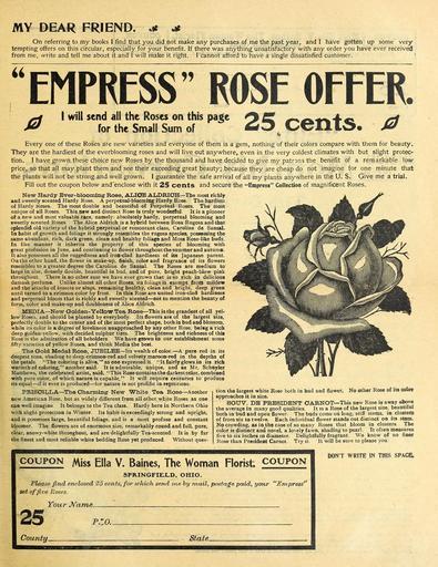 Keywords: Beautify your homes (15729969933).jpg MY DEAR FRIEND a <br> On referring to my books I find that you did not make any purchases of me the past year and I have gotten up some very- <br> tempting offers on this circular especially for your benefit If there was anything unsatisfactory with any order you have ever received <br> from me write and tell me about it and 1 will make it right I cannot afford to have a single dissatisfied customer <br> EMPRESS ROSE OFFER <br> I will send all the Roses on this page <br> for the Small Sum of <br> 25 cents <br> Every one of these Roses are new varieties and everyone of them is a gem nothing of their colors compare with them for beauty <br> They are the hardiest of the everblooming roses and will live out anywhere even in the very coldest climates with but slight protec- <br> tion I have grown these choice new Roses by the thousand and have decided to give my patrons the benefit of a remarkable low <br> price so that all may plant them and see their exceeding great beauty; because they are cheap do not imagine for one minute that <br> the plants will not be strong and well grown I guarantee the safe arrival of all my plants anywhere in the U S Give me a trial <br> Fill out the coupon below and enclose with it 25 cents and secure the Empress Collection of magnificent Roses <br> New Hardy Ever-blooming Rose ALICE ADDRIOH The most richly <br> and sweetly scented Hardy Rose A perpetual-blooming Hardy Rose The hardiest <br> of Hardy Koses The most double and beautiful of Perpetual Roses The most <br> unique of all Roses This new and distinct Rose is truly wonderful It is a pioneer <br> of a new and most valuable race namely absolutely hardy perpetual blooming and <br> sweetly scented Roses The Alice Aldrich is a hybrid between Rosa Rugosa and that <br> splendid old variety of the hybrid perpetual or remontant class Caroline de Sansal <br> In habit of growth and foliage it strongly resembles the rugosa species possessing the <br> same abundant rich dark green clean and healthy foliage and Moss Rose-like buds <br> In like manner it inherits the property of this species of blooming with <br> great profusion in June and continuing to flower throughout the summer and autumn <br> It also possesses all the ruggedness and iron-clad hardiness of its Japanese parent <br> On the other hand the flower in make-up finish color and fragrance of its flowers <br> resembles to a greater degree the Caroline de Sansal The Roses are medium to <br> large in size densely double beautiful in bud and of pure bright peach-blow pink <br> throughout There is no other rose we have ever grown that is so rich in delicious <br> damask perfume Unlike almost all other Roses its foliage is exempt from mildew <br> and the attacks of insects or slugs remaining healthy clean and bright deep green <br> until turned to a crimson color by frost In this Rose are united iron-clad hardiness <br> and perpetual bloom that is richly and sweetly scented not to mention the beauty of <br> form color and make-up and doubleness of Alice Aldrich <br> MEDIA New Golden- Yellow Tea Rose This is the grandest of all yel- <br> low Roses and should be planted by everybody Its flowers are of the largest size <br> perfectly double to the center and of the most perfect shape both in bud and blossom <br> while its color is a degree of loveliness unapproached by any other Rose beiag a rich <br> deep golden-yellow with decided sulphur tints The brightness and richness of this <br> Rose is the admiration of all beholders We have grown in our establishment some <br> fifty varieties of yellow Roses and think Media the best <br> The Gold Medal Rose JUBILEE Its wealth of color A pure red in its <br> deepest tone shading to deep crimson-red and velvety maroon-red in the depths of <br> the petals The coloring is alive as one expressed it It fairly glows in its rich <br> warmth of coloring another said It is admirable unique and as Mr Schnyler <br> Matthews the celebrated artist said This Rose contains the darkest eclor combined <br> with pure color of which nature is capable It will require centuries to produce <br> its equal if it ever is produced for nature i3 not prolific in repititions <br> PRISOILLiA The Charming New White Tea Rose Another <br> new American Rose but as widely different from all other white Roses as one <br> can well imagine It belongs to the Tea class Hardy here in Northern Ohio <br> with slight protection in Winter Its habit is exceedingly strong and upright <br> and it possesses large beautiful foliage and is a most profuse and constant <br> bloomer The flowers are of enormous size remarkably round and full pure <br> clear snowy-white throughout and are delightfully Tea-scented It is by far <br> the finest and most reliable white bedding Rose yet produced Without ques- <br> tion the largest white Rose both in bud and flower No other Rose of its color <br> approaches it in size <br> SOUV DE PRESIDENT OARNOT This new Rose is away above <br> the average in many good qualities It is a Rose of the largest size beautiful <br> both in bud and open flower The buds come on long stiff stems in clusters <br> of from six to twelve Each individual flower stands out distinct on its stem <br> No crowding as in the case of so many Roses that bloom in clusters The <br> color is distinct and novel a lovely fawn shading to pearl It often measures <br> five to six inches in diameter Delightfully fragrant We know of no finer <br> Rose than President Carnot Try it It will be sure to please you <br> coupon Miss Ella V Baines The Woman Florist coupon <br> SPRINGFIE LD OHIO <br> Please find enclosed 25 cents for which send me by mail postage paid your Empress' <br> set of five Moses <br> 25 <br> County <br> Your Name <br> PZO <br> State <br> DON'T WRITE IN THIS SPACE 41878669 131125 64689 Text http //www biodiversitylibrary org/page/41878669 1918 10 1080/00222939708680643 Ella V Baines Firm ; Henry G Gilbert Nursery and