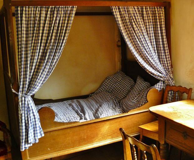 Keywords: bed four poster bed room antique sleep nostalgia place to sleep sleeping place setup bedroom farmhouse farm museum furniture curtains bed linen beds historically old