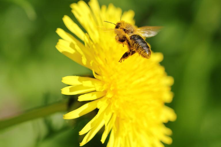 Keywords: bee flight dandelion flowers pollen forage insects garden