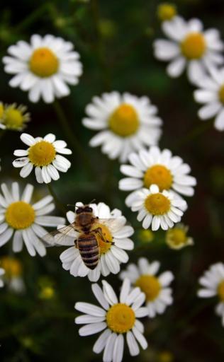 Keywords: bee honey bee pollen insect close blossom bloom bloom flower chamomile nectar european honey bee flight insect animal apis mellifera nature meadow wild flower