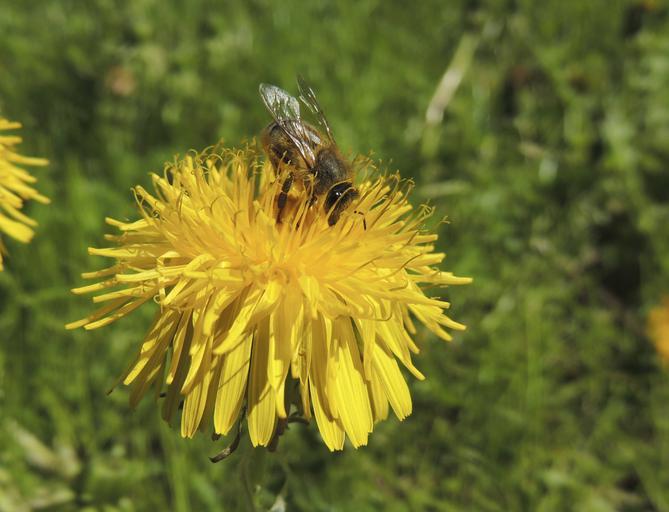 Keywords: bee insect nectar honey meadow dandelion yellow spring garden plant blossom bloom grass flower