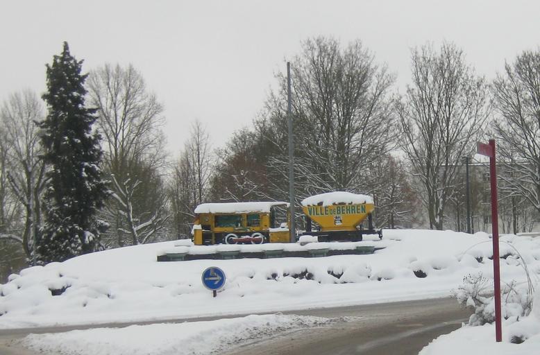 Keywords: Behren.jpg en Behren fr entrée de Behren own œuvre personnelle 2010-02-02 Behren-lès-Forbach Roundabout art in France Snow in Moselle