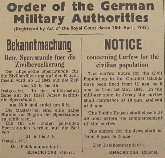 Keywords: Bekanntmachung 1942 curfew Jersey.jpg 1942 Avis Allemand dé duthant l'Otchupâtion d'Jèrri 192 German decree from Occupation of Jersey English text reads Order of the German Military Authorities registered by Act of the Royal Court dated 28th April 1942 Notice Concerning Curfew for the civilian population The curfew hours for the Civil Population in the Channel Islands have been fixed from 11 p m to 5 a m as from 1st May 1942 In the military zone in Jersey the curfew shall commence at 10 pm and end at 5 a m The Public Houses shall close half an hour before the commencement of the curfew The curfew for the Jews shall be from 9 p m to 5 a m Der Feldkommandt KNACKFUSS Colonel PD-GermanGov own photo of old document 2013-03-26 13 40 29 Man vyi German military orders in Jersey 1942 in Jersey Curfews Antisemitism