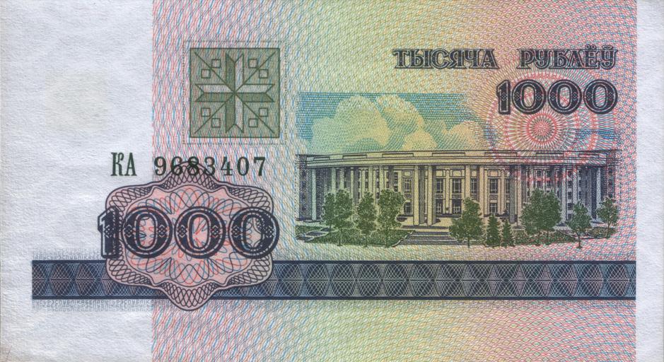 | Keywords: Belarus-1998-Bill-1000-Obverse.jpg 1000 ублей Бело уссии 1998 1000 roubles of Belarus 1998 own scan 1998 National Bank of Republic of Belarus ациональный банк Республики Бела усь ацыянальны Банк Рэспублiкi Бела усь PD-BY-exempt banknotes Banknotes of Belarus 1994-1999 Academy of Sciences of Belarus on banknotes Banknotes with a face value of 1000 |
