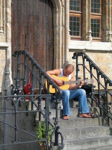 Keywords: belgium building steps man guitar acoustic music play person