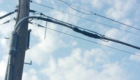 | Keywords: copper telephone line trunk bell atlanta era verizon 1930s lead splice sheathed soldered electrical tape usa infrastructure pots dsl landline internet outdoor telephone wire cable This photo was taken May 13th, 2016 in the Town of Williamsville, NY. Pictured here is a copper trunk owned by Verizon Communications, which has undergone years of neglect. This copper connection is Lead Sheathed Cable, with Soldered Splice cases, dating back to the 1930s. This cable has lost one of the soldered splice cases, resulting in the wiring being exposed to the elements. Verizon technicians have bandaged the problem with weather resistant electrical tape. This is an example of the deteriorating infrastructure used to carry Internet and Telephone services in the United States, and is a prime candidate for replacement with Fiber Optics. This photo was taken May 13th, 2016 in the Town of Williamsville, NY. Pictured here is a copper trunk owned by Verizon Communications, which has undergone years of neglect. This copper connection is Lead Sheathed Cable, with Soldered Splice cases, dating back to the 1930s. This cable has lost one of the soldered splice cases, resulting in the wiring being exposed to the elements. Verizon technicians have bandaged the problem with weather resistant electrical tape. This is an example of the deteriorating infrastructure used to carry Internet and Telephone services in the United States, and is a prime candidate for replacement with Fiber Optics. |