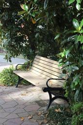 Keywords: bench park peaceful tranquil sunlight green
