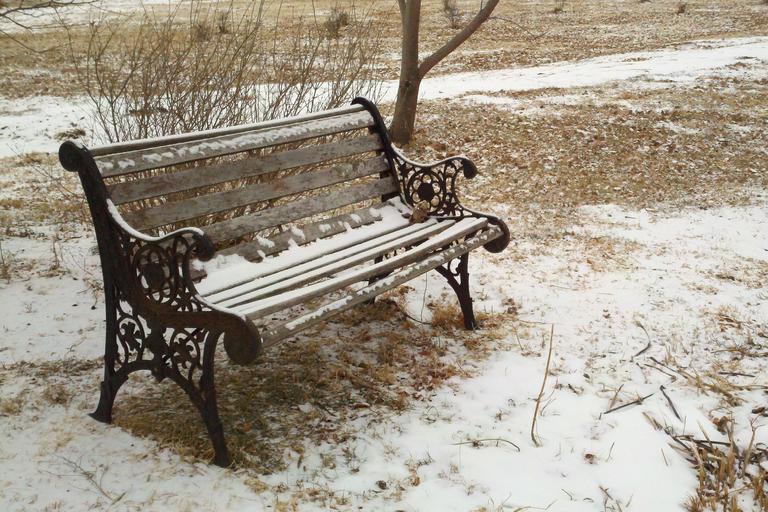 Keywords: bench park snow winter grass cast iron wood seat cold quiet lonely