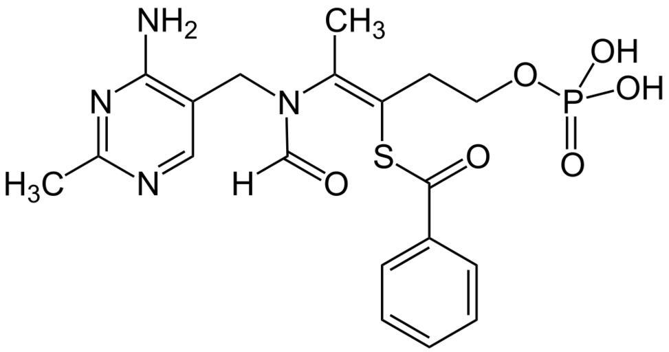 Keywords: Benfotiamine Structural Formulae.svg Benfotiamine Structural Formulae Benfotiamin Strukturformel own Jü 2011-08-15 Cc-zero Pyrimidines Thiobenzoate esters Organophosphates