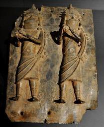 MAKE A MEME View Large Image Benin Bronze Weltmuseum1.jpg Reliefplatte mit Darstellung zweier Würdenträger mit Kugelrassel Kleidung Wickelröcke aus gemustertem Stoff vermutlich importierte indische Stoffe oder Brokat aus Europa ; Königtum Benin Nigeria 16 /17 Jh ; ...