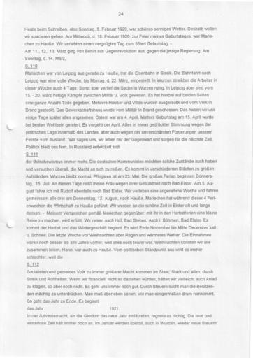 | Keywords: Bennewitz Fortsetzung der Chronik zusammengefasst 0023.jpg Bennewitz - Chronik einer Kürschnerfamilie Abschrift der Seite siehe unten Dieser Teil ist überschrieben mit <br/>Fortsetzung der Chronik der Familie Bennewitz in Wurzen Hier in diesem Kasten muß sich die alte Chronik der Familie Bennewitz befinden welche in der Zeit von 1692 bis 1835/39 geschrieben worden ist und Auskunft über die Familie während dieser Zeit gibt Um die Chronik der Familie Bennewitz deren alte Aufzeichnungen vom Jahre 1692 bis 1835/39 sich in dem Buche befinden welches sich in dem vorhergehenden Kasten befindet fortführen zu können ließ ich dieses Buch anfertigen weil das alte Buch keine alten Blätter mehr hatte <br/> Wurzen im August 1909 Ernst Oskar Bennewitz Neun Generationen Kürschnermeister Bennewitz in Wurzen seit 1652 bis zur Flucht 1952 immer an gleicher Stelle Albert-Kuntz-Straße 1 Ecke Schuhgasse Anschließend in Frankfurt/Main Die zehnte Generation Otto Bennewitz jetzt 2010 in Garmisch-Partenkirchen das Haus ist wieder in Familienbesitz Nachfolgend die nochmalige mit einem Texterkennungsprogramm gelesene unkorrigierte Abschrift der abgebildeten Seite Blatt 24 der Abschrift Heute beim Schreiben also Sonntag 8 Februar 1920 war schönes sonniges Wetter Deshalb wollen wir spacieren gehen Am Mittwoch d 18 Februar 1920 zur Feier meines Geburtstages war Mariechen zu Hauße Wir verlebten einen vergnügten Tag zum 55ten Geburtstag - Am 11 12 13 März ging von Berlin aus Gegenrevolution aus gegen die jetzige Regierung Am Sonntag d 14 März S 110 Mariechen war von Leipzig aus gerade zu Hauße trat die Eisenbahn in Streik Die Bahnfahrt nach Leipzig war eine volle Woche bis Montag U 22 März eingestellt In Wurzen streikten die Arbeiter in dieser Woche auch 4 Tage Sonst aber verlief die Sache in Wurzen ruhig In Leipzig aber sind vom 15 - 20 März heftige Kämpfe zwischen Militär u Volk gewesen Es hat hierbei auf beiden Seiten eine ganze Anzahl Tode gegeben Mehrere Häußer und Villas wurden ausgeraubt und vom Volk in Brand gesteckt Das Gewerkschaftshaus wurde vom Militär in Brand geschossen Das haben wir uns einige Tage später alles angesehen Ostern war am 4 April Mutters Geburtstag am 15 April wurde bei besten Wohlsein gefeiert Es vergeht der April Alles in etwas gedrückter Stimmung wegen der politischen Lage innerhalb des Landes aber auch wegen der unverschämten Forderungen unserer Feinde vom Ausland Wir sagen uns wir leben nur der Gegenwart und sorgen für die nächste Zeit Politick bleib uns fern In Russland entwickelt sich S 111 der Bolschewismus immer mehr Die deutschen Kommunisten möchten solche Zustände auch haben und versuchen überall die Macht an sich zu reißen Es kommt in verschiedenen Städten zu großen Aufständen VVurzen bleibt normal Pfingsten ist am 23 Mai Die großen Ferien beginnen Donnerstag 15 Juli An diesen Tage reißt meine Frau wegen ihrer Gesundheit nach Bad Elster Am 5 August fahre ich mit Rudolf ebenfalls nach Bad Elster Wir verleben eine angenehme Woche und fahren gemeinsam alle drei am Donnerstag 12 August nach Hauße Mariechen hat während dieser 4 Ferienwochen die Wirtschaft zu Hauße geführt Wir werden an die schöne Zeit in Elster oft und lange denken - Meinem Versprechen gemäß Mariechen gegenüber mit ihr in den Herbstferien eine kleine Reise zu machen wird erfüllt Wir reisen nach Hof Bad Steben Asch i Böhmen Bad Elster Es kommt der Herbst und das Wintergeschäft beginnt Es wird Ende November bis Mitte December kalt u Schnee Die letzte Woche vor Weihnachten aber Regen und wärmeres Wetter Die Einnahmen waren noch besser als alle Jahre vorher weil alles noch teurer war Weihnachten konnten wir alle zusammen feiern Hanni war auch zu Hauße Vom politischen Standpunkt aus wird es immer schlechter weil die S 112 Socialisten und gemeines Volk zu immer größerer Macht kommen im Staat Stadt und allen durch Streik und Rohheiten Wenn wir financiell nicht so dastehen würden hätten wir vielleicht auch Anlaß zu klagen so aber noch nicht Es geht uns immer noch gut Durch Steuern sucht man die Besitzenden mächtig zu unterdrücken Man muß aber eben sehen wie man einigermaßen drum rumkommt So geht das Jahr zu Ende Es beginnt das Jahr 1921 In der Sylvesternacht als die Glocken das neue Jahr einläuteten regnete es tüchtig Die laue und winterlose Zeit hält immer noch an Im Januar werden überall auch in Wurzen wieder neue Steuern seealso category Furriers Bennewitz in Wurzen Germany Weitere Bilder und Familien- und Firmenchronik Furrier family Bennewitz in Wurzen Germany since 1652 Own Begonnen 1909 Bennew <span class signature-talk >talk</span> 15 04 7 June 2010 UTC Fortsetzung der Chronik der Familie Bennewitz in Wurzen |