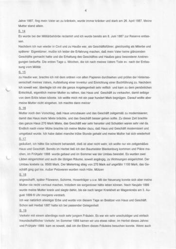 Keywords: Bennewitz Fortsetzung der Chronik zusammengefasst 0003.jpg Bennewitz - Chronik einer Kürschnerfamilie Abschrift der Seite siehe unten Dieser Teil ist überschrieben mit <br/>Fortsetzung der Chronik der Familie Bennewitz in Wurzen Hier in diesem Kasten muß sich die alte Chronik der Familie Bennewitz befinden welche in der Zeit von 1692 bis 1835/39 geschrieben worden ist und Auskunft über die Familie während dieser Zeit gibt Um die Chronik der Familie Bennewitz deren alte Aufzeichnungen vom Jahre 1692 bis 1835/39 sich in dem Buche befinden welches sich in dem vorhergehenden Kasten befindet fortführen zu können ließ ich dieses Buch anfertigen weil das alte Buch keine alten Blätter mehr hatte <br/> Wurzen im August 1909 Ernst Oskar Bennewitz Neun Generationen Kürschnermeister Bennewitz in Wurzen seit 1652 bis zur Flucht 1952 immer an gleicher Stelle Albert-Kuntz-Straße 1 Ecke Schuhgasse Anschließend in Frankfurt/Main Die zehnte Generation Otto Bennewitz jetzt 2010 in Garmisch-Partenkirchen das Haus ist wieder in Familienbesitz Nachfolgend die nochmalige mit einem Texterkennungsprogramm gelesene unkorrigierte Abschrift der abgebildeten Seite Blatt 4 der Abschrift Jahre 1887 fing mein Vater an zu kränkeln wurde immer kränker und starb am 26 April 1887 Meine Mutter stand allein S 14 Es wurde bei der Militärbehörde reclamirt und ich wurde bereits am 8 Juni 1887 zur Reserve entlassen Nachdem ich nun wieder in Civil und zu Hauße war als Geschäftsführer gleichzeitig als Miterbe und späterer Eigentümer mußte ich leider die Erfahrung machen daß mein Vater keine glänzenden Geschäfte gemacht hatte und die Erhaltung des Geschäftes und Haußes ganz besonderer Anstrengungen bedurfte Die ersten Tage u Wochen die ich nach meines Vaters Tode ev nach der Entlassung vom Militär S 15 zu Hauße war brachte ich mit dem ordnen von alten Papieren durchsehen und prüfen der Hinterlassenschaft meines Vaters Aufstellung einer Inventur und Einrichtung einer Buchführung zu Nachdem ich soweit war überlegte ich mir die ganze Angelegenheit sehr reiflich und kam zu dem persönlichen Entschluß eigentlich meiner Mutter zu rathen das Haus und Geschäft zu verkaufen damit selbige von dem Erlös leben könnte Ich wollte mich mit ein paar hundert Mark begnügen Darauf wollte aber meine Mutter nicht eingehen Ich machte dann meiner S 16 Mutter noch den Vorschlag daß Haus umzubauen und das Geschäft zeitgemäß zu modernisieren; damit das Haus mehr Miete brächte und das Geschäft besser gehen sollte Zu dieser Zeit brachte das ganze Haus 270 Mark Miete das Geschäft war sehr herunter und Schulden waren sehr viel da Endlich nach vieler Mühe brachte ich meine Mutter dazu daß Haus und Geschäft modernisiert und umgebaut wurde Ich habe dabei manche trübe Stunde gehabt und meine Mutter hat sich wiederholt S 17 geäußert ich hätte Sie schlecht behandelt dieß ist aber nicht wahr ich wollte nur ein zeitgemäßes Haus und Geschäft Bereits im Herbst ließ ich den Baumeister Blankenburg kommen und Pläne machen im Frühjahr 1888 wurde gebaut und im Sommer war der Umbau beendet Es wurden zwei Läden eingerichtet und auch die übrigen Räume soweit angängig zu Wohnungen eingerichtet Der Umbau kostete ca 8500 Mark Der Mietertrag stieg von 270 Mark auf ungefähr 1100 Mark das Geschäft ging gut los Außer Pelzwaren wurden noch Hüte Mützen S 18 angeschafft später Filzwaren Schirme Hosenträger u s w Mit der Neuerung konnte sich aber meine Mutter nie recht vertraut machen trotzdem sie sorgenloser hätte leben können Nach Neujahr 1889 wurde meine Mutter krank und siegte dahin bis sie nach langer Krankheit an Magenkrebs am 3 August 1889 6 Uhr morgens verstarb Ich war natürlich alleiniger Erbe und wurde von diesem Tage an Besitzer von Haus und Geschäft Schon seit Herbst 1887 hatte ich bei passender Gelegenheit S 19 Verkehr mit einem allerdings noch sehr jungem Fräulein Es war ein sehr unschuldiger und einfach freundschaftlicher Verkehr Im Sommer 1888 kamen wir uns etwas näher im Herbst dieses Jahres und Frühjahr 1889 kam es soweit daß ich die Eltern dieses Fräuleins besuchen konnte Wenn auch seealso category Furriers Bennewitz in Wurzen Germany Weitere Bilder und Familien- und Firmenchronik Furrier family Bennewitz in Wurzen Germany since 1652 Own Begonnen 1909 Bennew <span class signature-talk >talk</span> 15 04 7 June 2010 UTC Fortsetzung der Chronik der Familie Bennewitz in Wurzen