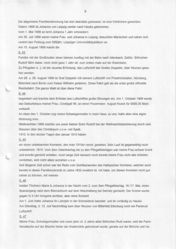 | Keywords: Bennewitz Fortsetzung der Chronik zusammengefasst 0008.jpg Bennewitz - Chronik einer Kürschnerfamilie Abschrift der Seite siehe unten Dieser Teil ist überschrieben mit <br/>Fortsetzung der Chronik der Familie Bennewitz in Wurzen Hier in diesem Kasten muß sich die alte Chronik der Familie Bennewitz befinden welche in der Zeit von 1692 bis 1835/39 geschrieben worden ist und Auskunft über die Familie während dieser Zeit gibt Um die Chronik der Familie Bennewitz deren alte Aufzeichnungen vom Jahre 1692 bis 1835/39 sich in dem Buche befinden welches sich in dem vorhergehenden Kasten befindet fortführen zu können ließ ich dieses Buch anfertigen weil das alte Buch keine alten Blätter mehr hatte <br/> Wurzen im August 1909 Ernst Oskar Bennewitz Neun Generationen Kürschnermeister Bennewitz in Wurzen seit 1652 bis zur Flucht 1952 immer an gleicher Stelle Albert-Kuntz-Straße 1 Ecke Schuhgasse Anschließend in Frankfurt/Main Die zehnte Generation Otto Bennewitz jetzt 2010 in Garmisch-Partenkirchen das Haus ist wieder in Familienbesitz Nachfolgend die nochmalige mit einem Texterkennungsprogramm gelesene unkorrigierte Abschrift der abgebildeten Seite Blatt 9 der Abschrift Die allgemeine Familienstimmung hat sich ebenfalls gebessert ist eine fröhlichere geworden Ostern 1909 ist Johanna von Leipzig wieder nach Hauße gekommen Vom 1 Mai 1909 an lernt Johanna 1 Jahr schneidern Am 30 Juli 1909 waren meine Frau und Johanna in Leipzig besuchten Mariechen und sahen sich vereint den Festzug zum 500jähr Leipziger Universitätsjubiläum an Am 10 August 1909 macht die S 43 Familie mit der Großmutter einen kleinen Ausflug mit der Bahn nach Altenbach Zeititz Söhnchen Rudolf fährt dabei noch nicht ganz 1 Jahr alt zum ersten male auf der Eisenbahn Zu Pfingsten d J ist die neueste Erfindung das Luftschiff des Grafen Zeppelin über Wurzen gesehen worden Am 28 u 29 August 1909 ist Graf Zeppelin mit seinem Luftschiff von Friedrichshafen Nürnberg Bitterfeld nach Berlin zum Kaiser Wilhelm gefahren Diese Fahrt galt als die erste große officielle Reichsfahrt Die ganze Welt ist über diese Fahrt S 44 begeistert und brachte dem Erfinder des Luftschiffes große Ehrungen ein Am 1 October 1909 wurde das Geburtshaus meiner Frau Crostigall 56 an einen Feuermann August Noack für 9000 00 Mark verkauft An eben den 1 October zog meine Schwiegermutter in mein Haus zu uns hatte aber eine eigne Wohnung inne Weihnachten 1909 machte uns unser kleiner Sohn Rudolf bei der Weihnachtsbescherung durch sein Staunen über den Christbaum u s w viel Spaß 1910 In den letzten Tagen des Januar 1910 haben S 45 wir einen unbekannten Kometen den man 1910er nennt gesehen Sein Lauf ist gegenwärtig noch unbestimmt 1910 Vom 2ten Osterfeiertag bis zu den Pfingstfeiertagen war meine Frau schwer krank und konnte garnicht arbeiten Auch lange Zeit darnach noch konnte meine Frau nicht alle Arbeiten verrichten sich nicht allein anziehen u s w Seit längerer Zeit schon war die Rede vom Sichtbarwerden des Halleyschen Kometen welcher auch bereits in dieser Familienchronik im Jahre 1835 erwähnt ist Ich habe um diesen Kometen recht gut sehen zu können mit meinen S 46 beiden Töchtern Marie Johanna in der Nacht vom 2 zum 3ten Pfingstfeiertag 16 /17 Mai einen Spaciergang nach dem Bismarkturm auf dem Wachtelberg bei Dehnitz gemacht Der Komet wurde gegen 3/4 3 Uhr morgens sichtbar aber ohne Schweif Am 1 Juni hatte Johanna Ihr Lehrjahr in der Schneiderei beendet und ist vorläufig zu Hauße Am Dienstag d 12 Juli Nachmittag kam über Wurzen von Bitterfeld Eilenburg noch ein Parseval Luftschiff S 47 Meine Frau Schwiegermutter und unser jetzt cir 2 Jahre altes Söhnchen Rudi waren weil die Familienwäsche auf der Bleiche hinter der Stadtmühle getrocknet wurde gerade auf der Bleiche und ha- haben seealso category Furriers Bennewitz in Wurzen Germany Weitere Bilder und Familien- und Firmenchronik Furrier family Bennewitz in Wurzen Germany since 1652 Own Begonnen 1909 Bennew <span class signature-talk >talk</span> 15 04 7 June 2010 UTC Fortsetzung der Chronik der Familie Bennewitz in Wurzen |