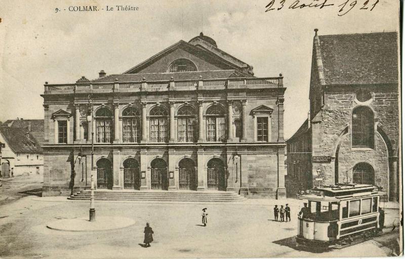 Keywords: BERGERET 9 - COLMAR - Le Théatre.JPG fr Carte postale ancienne éditée par Bergeret n°9 <br >Colmar - Le Théâtre Collection personnelle Scanné par Claude_villetaneuse Carte datée du 13 août 1921 pd-old 48 4 44 94 N 7 21 17 09 E region FR_heading N Historical images of Colmar Trams in Colmar Haut-Rhin in the 1920s Théâtre municipal de Colmar |