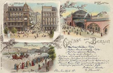 Keywords: Berlin-Mitte Postkarte 046.jpg Pariser Platz mit Brandenburger Tor Links oben Café Bauer und Café Kranzler in Berlin-Mitte Rechts Bahnhof Berlin Friedrichstraße http //www zeno org - Zenodot Verlagsgesellschaft mbH W Hagelberg Berlin 1898 PD-old Pariser Platz in the 19th century Brandenburg Gate 19th century Café Bauer Berlin-Mitte Café Kranzler Unter den Linden Unter den Linden in the 19th century Bahnhof Berlin Friedrichstraße in the 1890s Friedrichstraße in the 1890s Postcards of Friedrichstraße Postcards of Berlin-Mitte 1898 postcards of Germany Images from zeno org |
