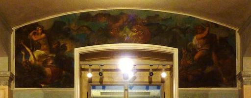 | Keywords: Berlin Neues Museum vaterländischer Saal Drachen restored.jpg  de Wandgemälde von Gustav Heidenreich im Vaterländischen Saal des Neuen Museums Berlin Vier Wassernixen lagern links am Seeufer Die liegende Nixe im Vordergrund pflückt Zweige von herabhängenden Blätterranken Daneben stützt sich eine zweite auf ihre Harfe Die beiden Nixen im Hintergrund schauen versonnen über den See Das mittlere Bildfeld zeigt einen Drachen im Greifengestalt mit Adlerkopf Adlerschwingen und Löwenkörper Fauchend und mit ausgebreiteten Flügeln wacht er über einen Schatz aus Helm Schild Schwert Krone Ringen und Münzen Auf der rechten Seite kämpfen zwei Riesen mit einem Drachen Sie versuchen ihm Felsbrocken in das aufgerissene Maul zu werfen Museumstext en Fresco by Gustav Heidenreich illustrating Norse mythology in the Fatherland Hall of the New Museum Berlin On the left four water nixes loll at a lakeshore The reclining nix in the foreground is picking branches from hanging leafy boughs Beside her a second nix is propped on her harp The two nixes in the background gaze pensively across the lake The central field shows a dragon in the shape of a griffon with an eagle's head eagle wings and a lion's body Hissing and with wings spread he guards over a treasure comprising a helmet a shield a sword a crown rings and coins On the right side two giants combat a dragon They are trying to throw boulders into its open maw photo of fresco in the Neues Museum Berlin file James Steakley; artwork Gustav Heidenreich 1852 thumb left 500px Fresco in 2000 prior to its restoration PD-Art Gustav Heidenreich Interior of the Neues Museum Berlin Nixes Creatures in Norse mythology |