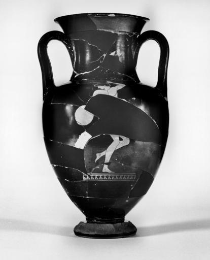 | Keywords: Berlin Painter - Doubleen with a Discobolos - Walters 4857 - Side B.jpg This doubleen depicts on the front a Discobolos Moving right he looks back to the left at the discus in his right hand His left hand is raised above his wreathed head and he supports himself on his right foot His left foot is raised off the round indicating that the throw is in progress On the back is a mantled youth standing left Wreathed he extends his right hand; the thumb and index and middle fingers are extended the other two are folded under ca 490 480 BC early Classical terracotta H 11 7/8 x Max Diam 6 13/16 in 30 2 x 17 3 cm ; Diam at rim cm 13 3 ; Diam at foot cm 8 4 accession number 48 57 37705 Don Marcello Massarenti Collection Rome 1897 cat no 213 Henry Walters city Baltimore Walters Art Museum Henry Walters Acquired by Henry Walters with the Massarenti Collection 1902 place of origin Attica Greece Walters Art Museum license Ancient Greek red-figure pottery in the Walters Art Museum Berlin Painter Media contributed by the Walters Art Museum needs category review Media contributed by the Walters Art Museum needs artist update Discobolus in ancient Greek pottery |